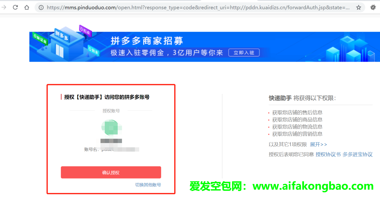 接上图点击“订购“按钮后,会跳转到快递助手-拼多多授权页面。使用拼多多APP扫码或店铺账号密码登录后显示如下界面,点击”确认授权“