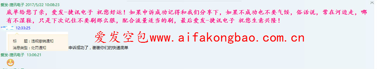 哈哈,又有一例使用我们爱发 - 捷讯电子(http://www.aifakongbao.com.cn)的单号降权申诉成功的案例,分享给大家:
